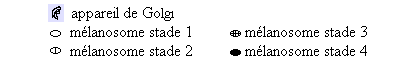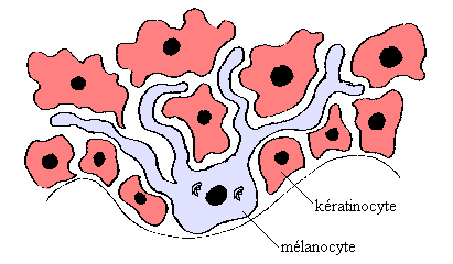 Dans les mélanocytes, on observe de nombreux mélanosomes qui vont migrer vers les dendrites et passer, par transfert, dans les kératinocytes voisins. C'est au niveau de ces mélanosomes qu'est produite la mélanine. Les mélanosomes évoluent en 4 stades (stades 1 et 2 structure filamentaire, stade 3 : la mélanine commence à s'accumuler, stade 4 : les mélanosomes sont remplis de pigments). Puis les mélanosomes passent, par transfert, dans les kératinocytes voisins.