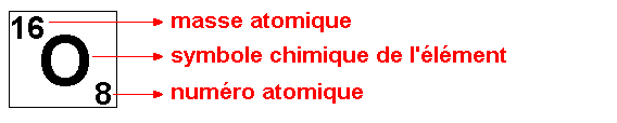 Dans le tableau de Mendeleïev, les éléments sont classés par ordre croissant. Ainsi chaque élément possède son numéro de classement: son numéro atomique (représenté par la lettre Z). Ce numéro correspond au nombre de protons que possède l'élément. Ainsi l'oxygène a le numéro atomique 8: son noyau comporte donc 8 protons. Le nombre d'électrons d'un atome étant égal au nombre de protons, le numéro atomique détermine donc également le nombre d'électrons. En plus du numéro atomique de chaque atome, le tableau indique aussi la masse atomique (représenté par la lettre A) de chaque élément. Ce chiffre indique également le nombre de nucléons de l'atome : Par conséquent, pour connaître le nombre de neutrons contenus dans le noyau d'un atome, il suffit de soustraire son numéro atomique à sa masse atomique.